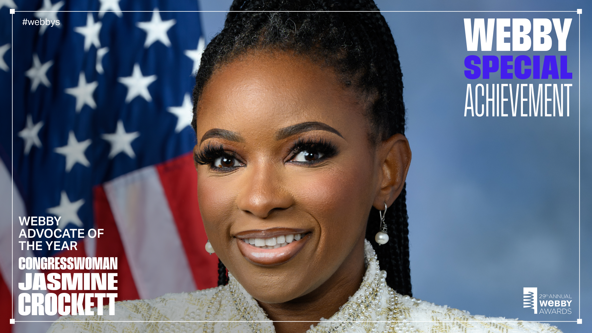 The International Academy of Digital Arts and Sciences (IADAS) and the NAACP would like to recognize Congresswoman Jasmine Crockett as the 2025 Webby Advocate of the Year for her transformative impact on racial justice, voting rights, and social equality. Through her dynamic use of digital platforms, Crockett has sparked crucial conversations, driving real change in both policy and public discourse.