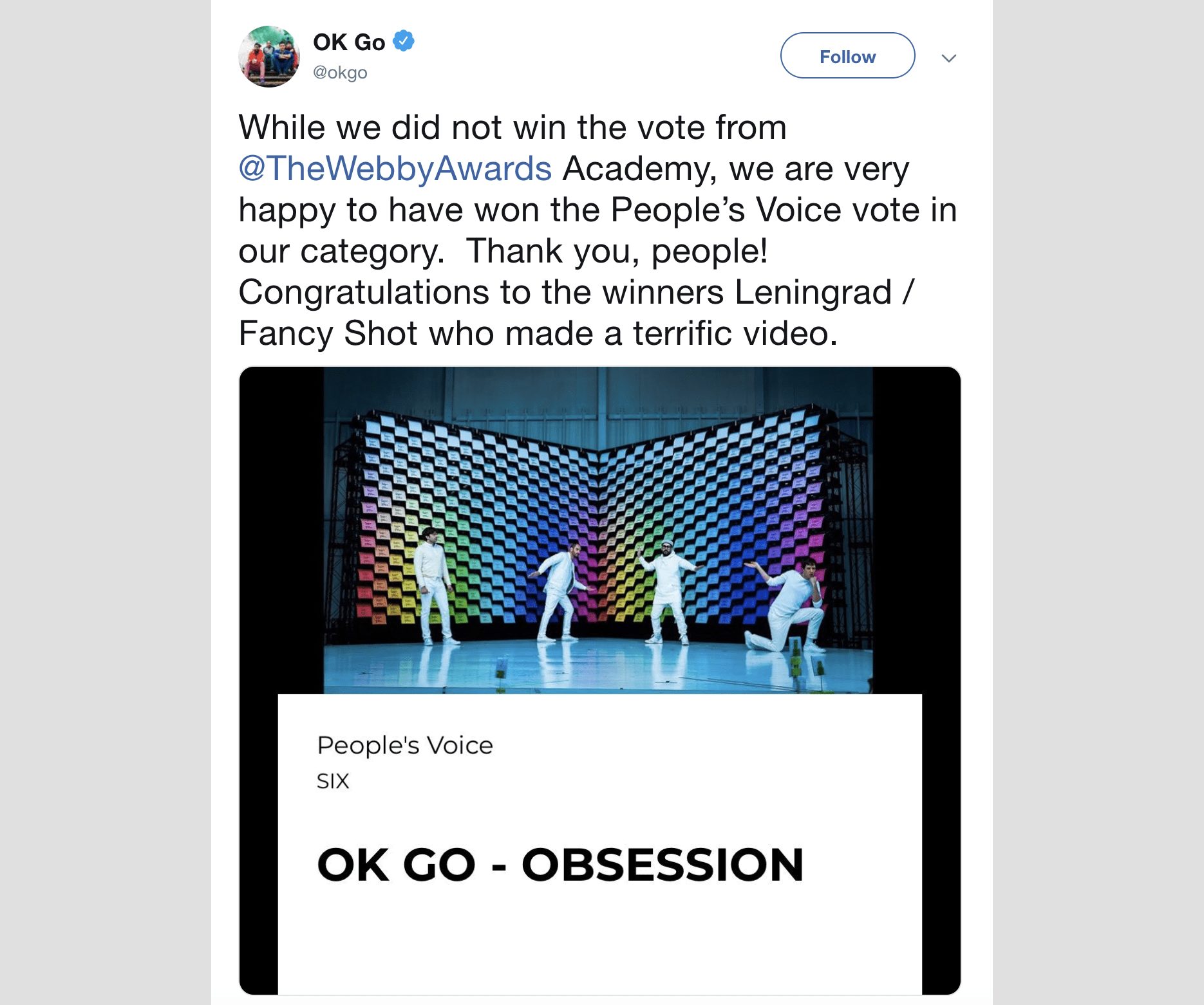 Here’s one that’s super easy to do: Click the dynamic share buttons next to your work in the Webby Gallery + Index, and boom! You’ve shared the news of your win to Facebook or Twitter. OK GO did it—you can too.