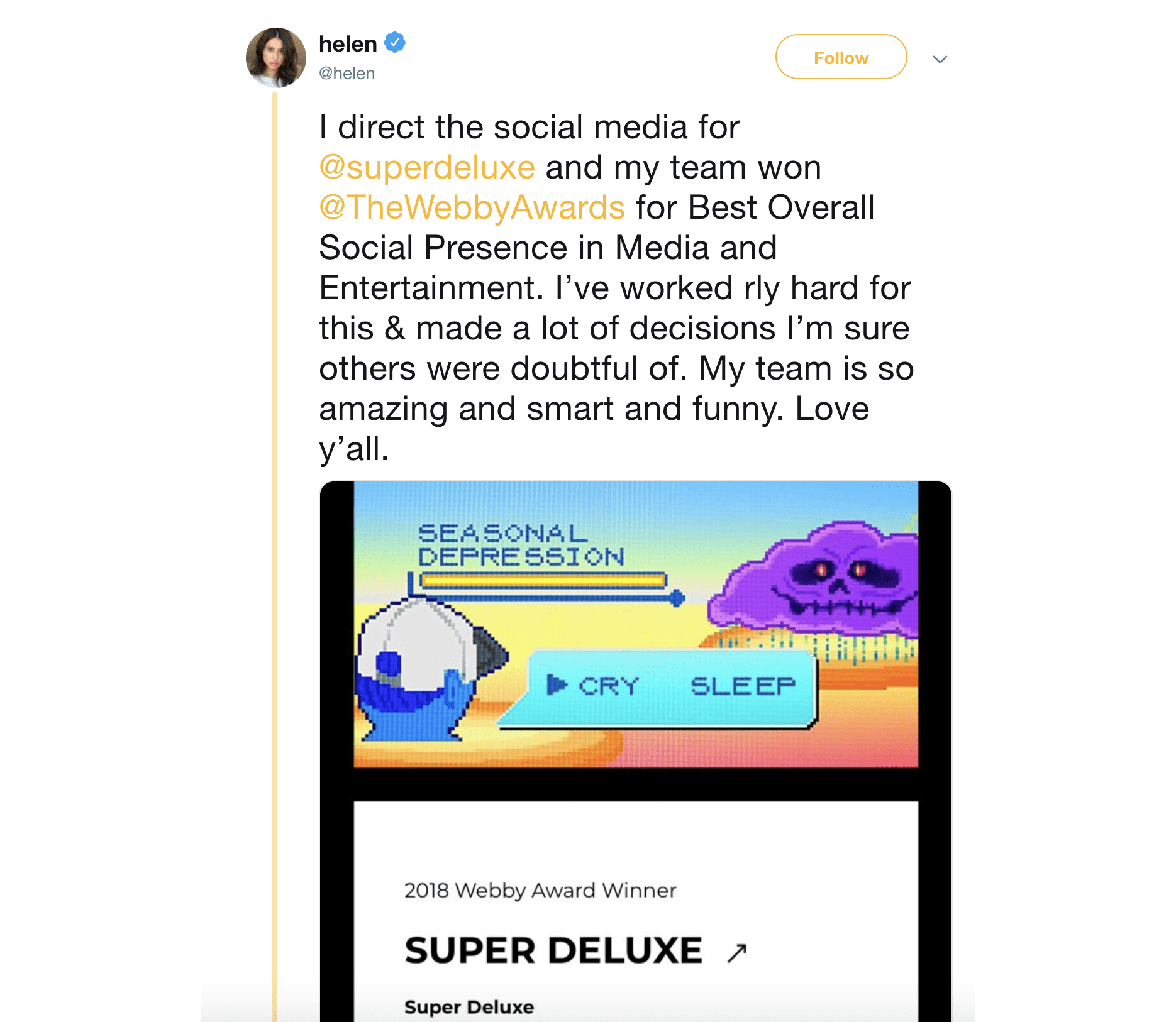 Sharing cool graphics is great and recommended. But, a heartfelt message about what your Webby win means to you (like Super Deluxe’s tweet) also goes a long way.
