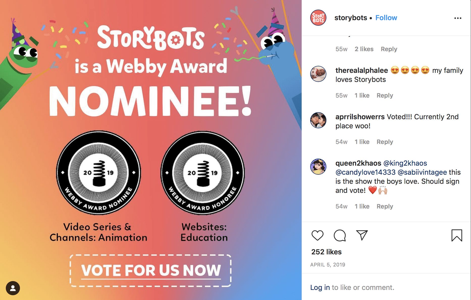 Share the news of your achievement to inform your supporters, and get them to the polls. To help you, we’ve designed the Webby Awards Campaign Kit that includes ready-to-post assets you can use to kickstart your campaign.