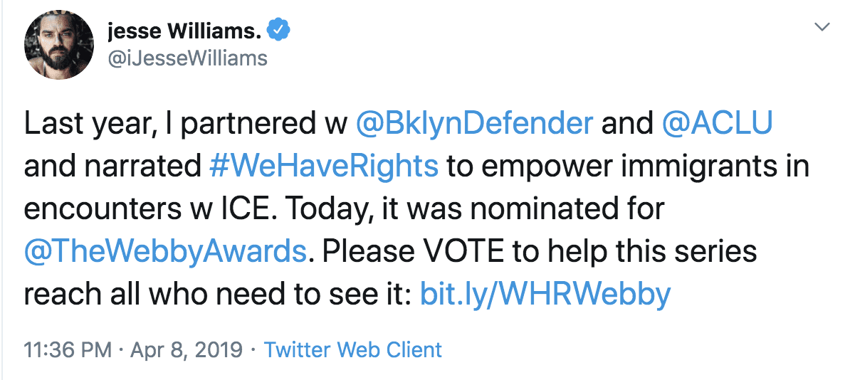 If your Webby-nominated project features a celebrity or influencer, or if you just happen to have friends in high places, nudge them to give your Nomination a shout out. Even micro-influencers have a lot of power to create a movement behind your campaign. The ACLU and Brooklyn Defender Services called on 2018 Webby Special Achievement Winner Jesse Williams. You can also always stop the Internet, using a celebrity like Celine Dion.