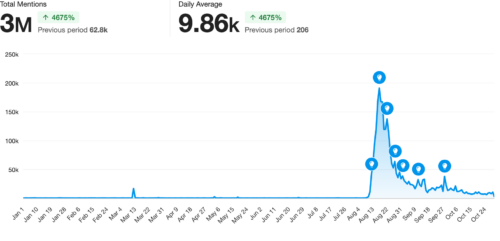 Conversations around being chronically online have only increased as the year has gone on. According to Meltwater’s social listening and media monitoring platform, there have been 4.5 million mentions of brainrot online throughout the year, with daily mentions ranging between 10K-20K.