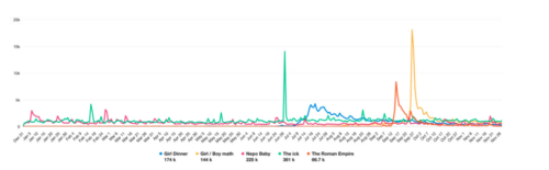 Viral social media phrases are fleeting. We used Meltwater’s social listening platform to analyze past keywords to understand exactly how popular they became — and how quickly they faded from our feeds. The graph shows how terms like “the ick”, “girl math” and “boy math”, and the Roman Empire meme experienced dramatic spikes before quickly dying off.